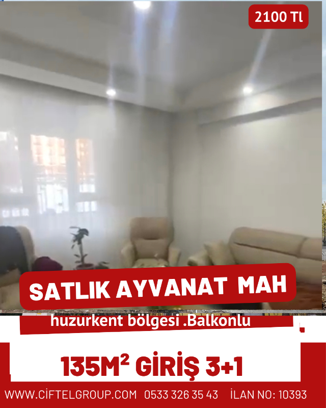Ayvanat Mahallesi, Huzurkent bölgesinde 135 m², 3+1, yüksek giriş, balkonlu dairemiz satılıktır. Fiyat: 2.100 TL