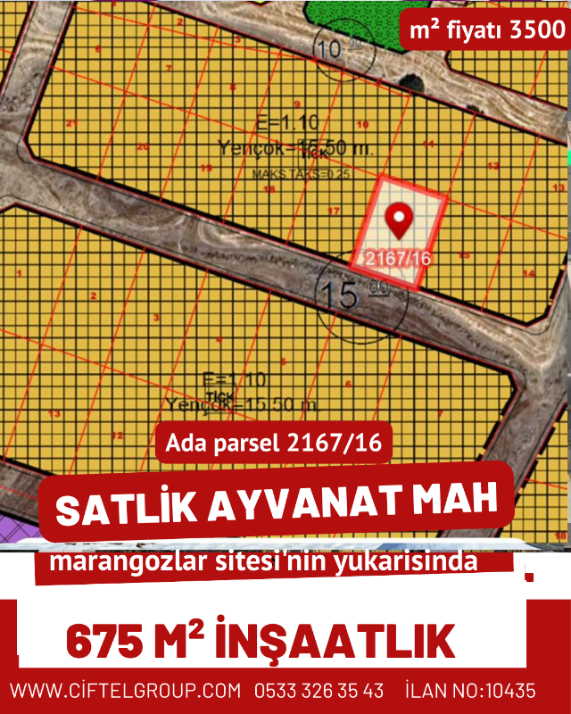 Ayvanat Mahallesi’nde, marangozların yukarısında, 2167 ada 16 parsel konumunda bulunan 675 m² arsa satılıktır. Metrekare fiyatı 3.500 TL’dir. İnşaat yapımına uygundur.