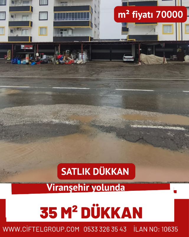 Satılık dükkan Viranşehir yolu üzerinde bulunan 35 m² dükkan satışa sunulmuştur. Metrekare fiyatı 70’tir. Konumu itibarıyla işlek bir bölgede yer almakta olup yatırım ve kullanım için uygundur.