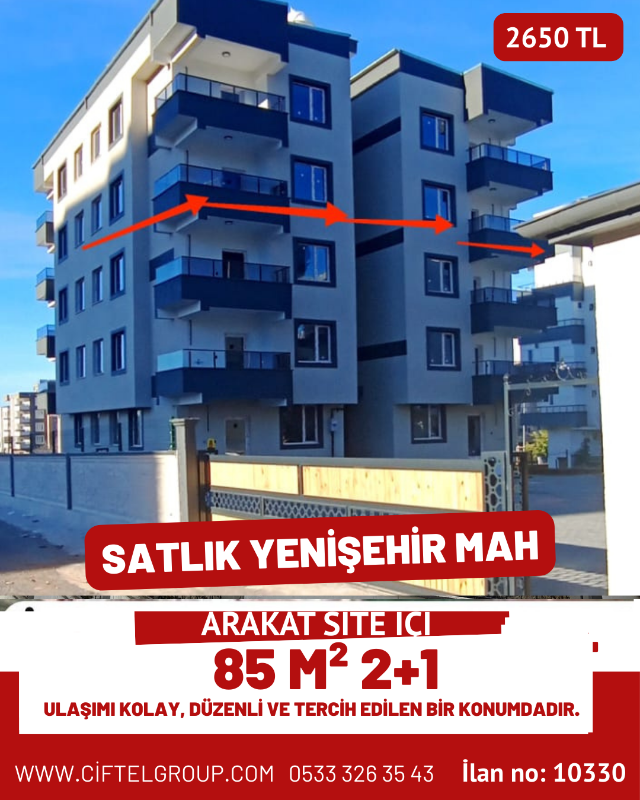 Yenişehir’de site içerisinde, güvenlikli 2+1 – 85 m² – arakat daire satılıktır. Ulaşımı kolay, düzenli ve tercih edilen bir konumdadır.
